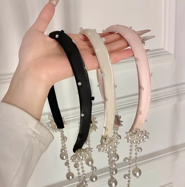 仙女粉水钻珍珠流苏发箍早春新中式高级感缎面头箍假耳环发饰头饰