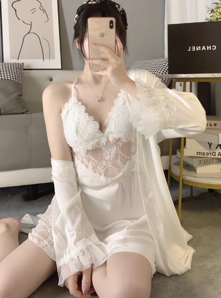 冰丝睡裙女性感吊带睡衣春秋镂空蕾丝纯欲风真丝家居服套装带胸垫