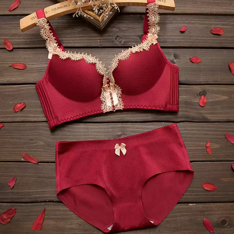 内衣套装女文胸聚拢无钢圈收副乳防下垂性感无痕上托红色加厚胸罩